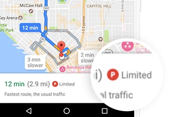 The new parking difficulty icon can be spotted in the directions card. The ratings usually range from limited to medium to easy, being based on historical parking data.
