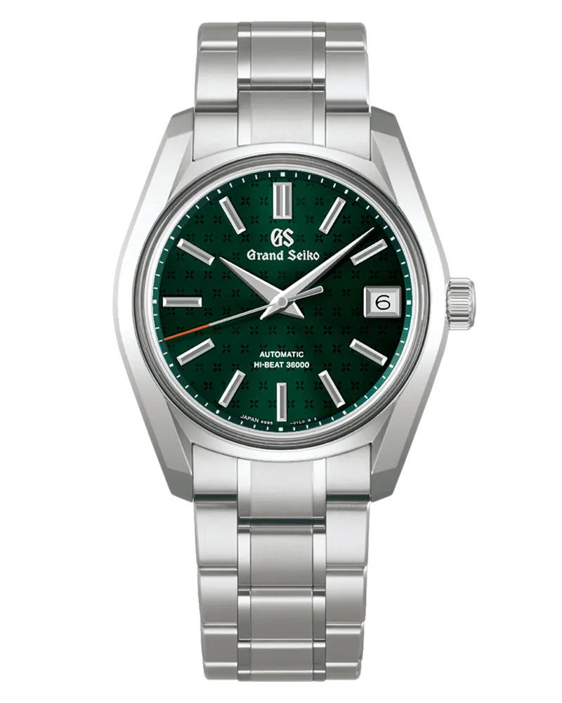 The SBGH375 features a green sunray dial with a repeating olive flower pattern, which is visible up close in the macro shots. The colour looks like a deep forest green under most lighting, which should shift slightly depending on angle. The seconds hand has a contrasting orange tip, a small accent that stands out against the darker dial tone without overpowering the design too much. A framed date window sits at the three-o’clock position. More details should be available once hands-on images of the watch are available.