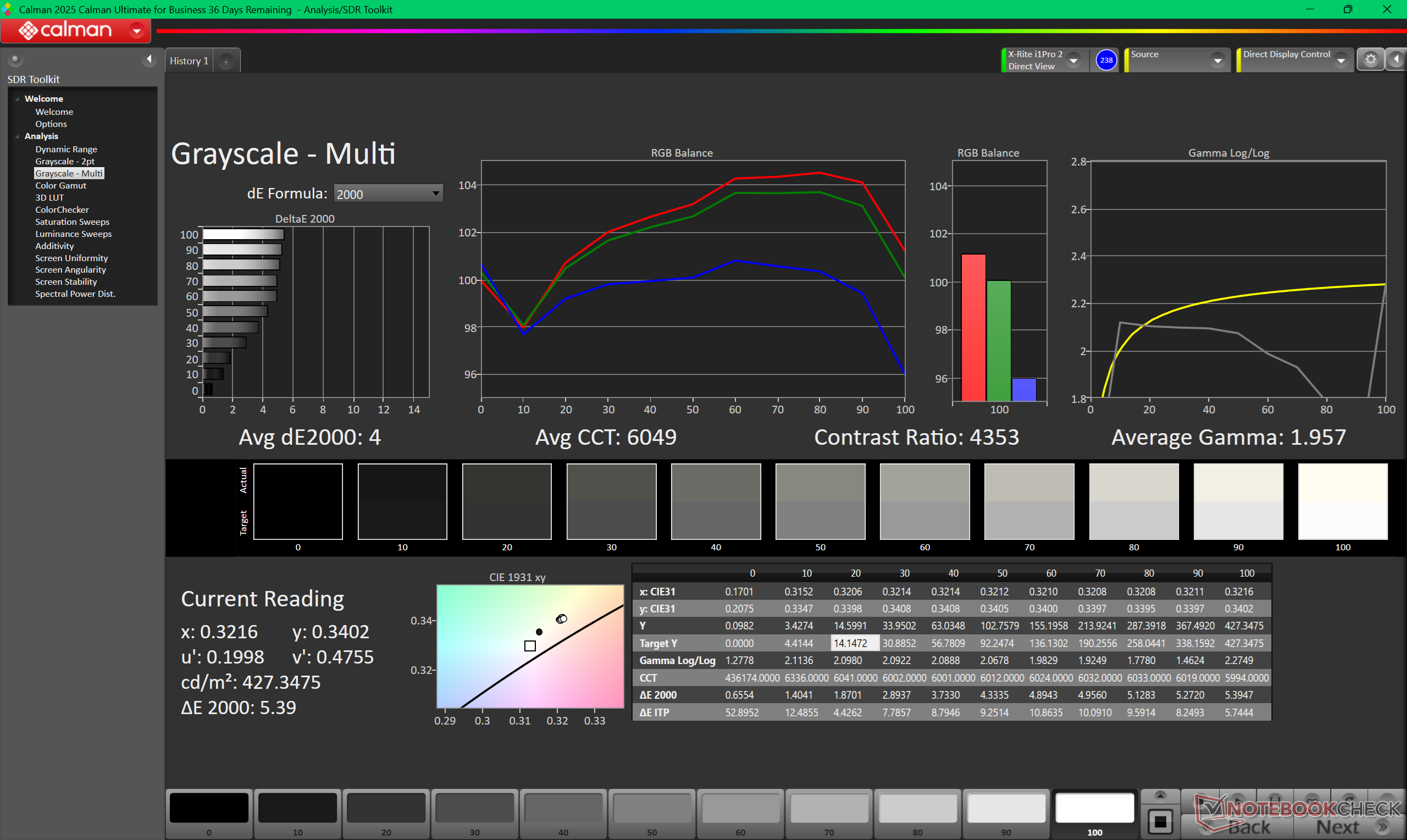 The panel is only decently calibrated out of the box with its overly warm color temperature and relatively low average deltaE grayscale and color values of 4.0 and 3.31, respectively. While not bad for a budget business laptop, an end-user calibration can be more difficult as the X-Rite software is not currently compatible with ARM machines.