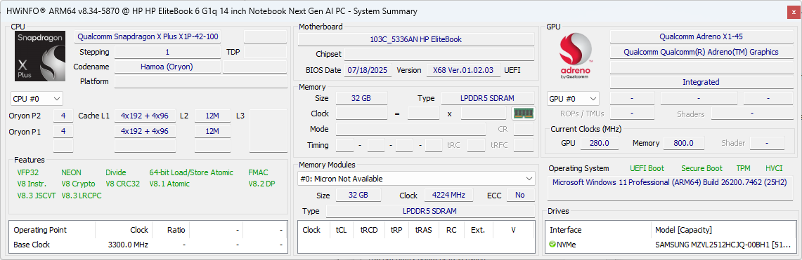 | HP EliteBook 6 G1q 14 Qualcomm Snapdragon X Plus X1P-42-100 ⎘ Qualcomm SD X Adreno X1-45 1.7 TFLOPS ⎘ 32 GB Memory, 512 GB SSD | Amazon: $1,344.89 List Price: 1300 USD | 1.5 kg | 17 mm | 14.00" 1920x1200 162 PPI IPS | |