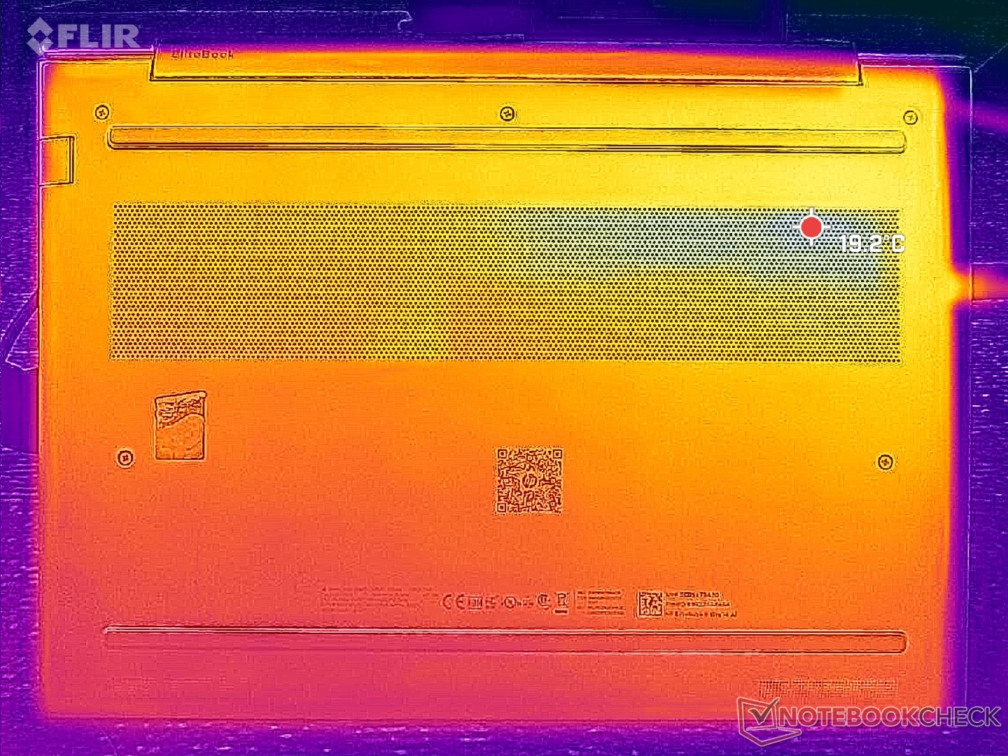 Surface temperatures are noticeably warmer on the left half of the chassis near the processor. Hot spots can reach around 40 C which is only slightly cooler than what we recorded on the Intel-powered ThinkPad E14 Gen 7.