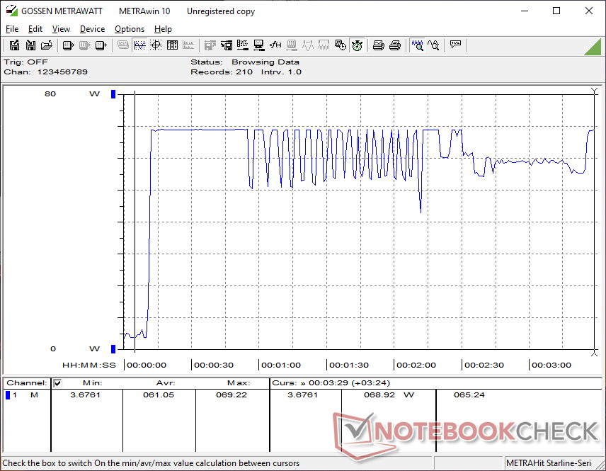We're able to record a maximum draw of 69 W from the small (~8.9 x 5 x 2.8 cm) 65 W USB-C AC adapter.