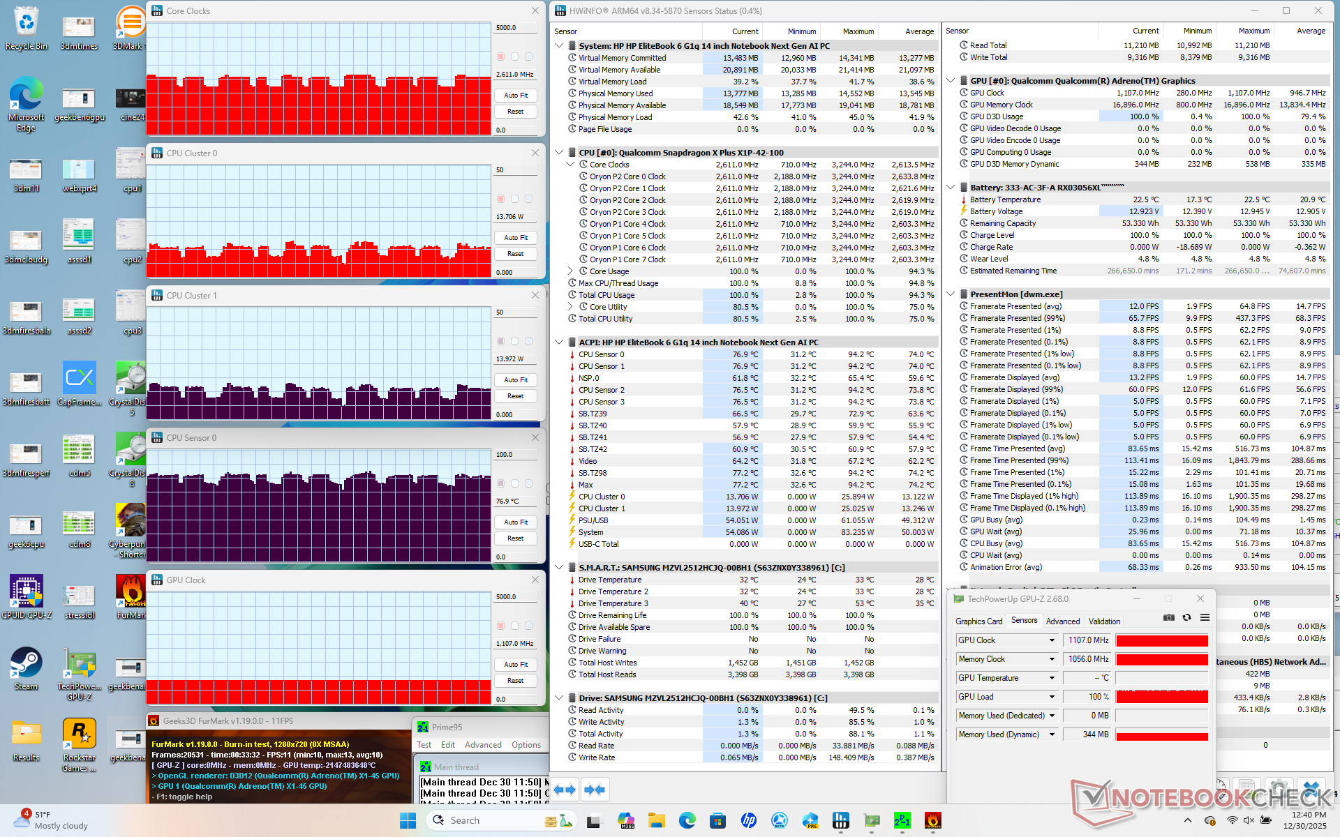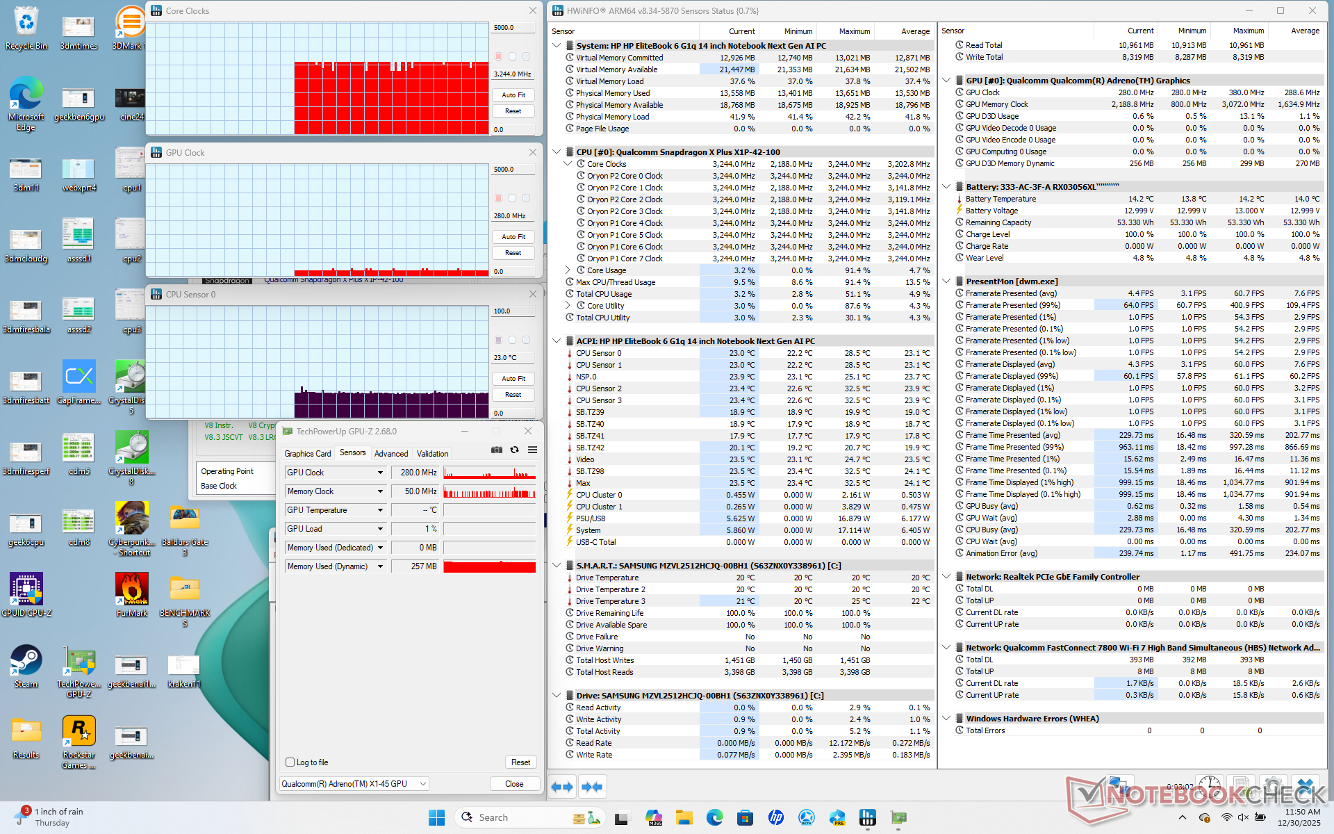 The Snapdragon-powered EliteBook is expectedly very efficient especially when running common day-to-day workloads like browsers or video. It can be more demanding than a Core Ultra 7 258V system like the ThinkPad T14 G6 when the CPU is fully stressed, but it offers faster performance at the same time for a similar level of performance-per-watt.