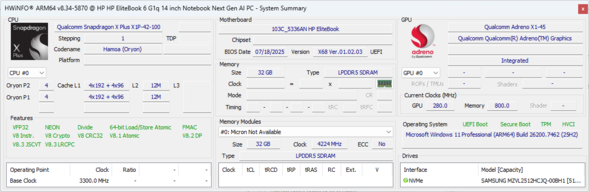 | HP EliteBook 6 G1q 14 Qualcomm Snapdragon X Plus X1P-42-100 ⎘ Qualcomm SD X Adreno X1-45 1.7 TFLOPS ⎘ 32 GB Memory, 512 GB SSD | Amazon: List Price: 1300 USD | 1.5 kg | 17 mm | 14.00" 1920x1200 162 PPI IPS | |