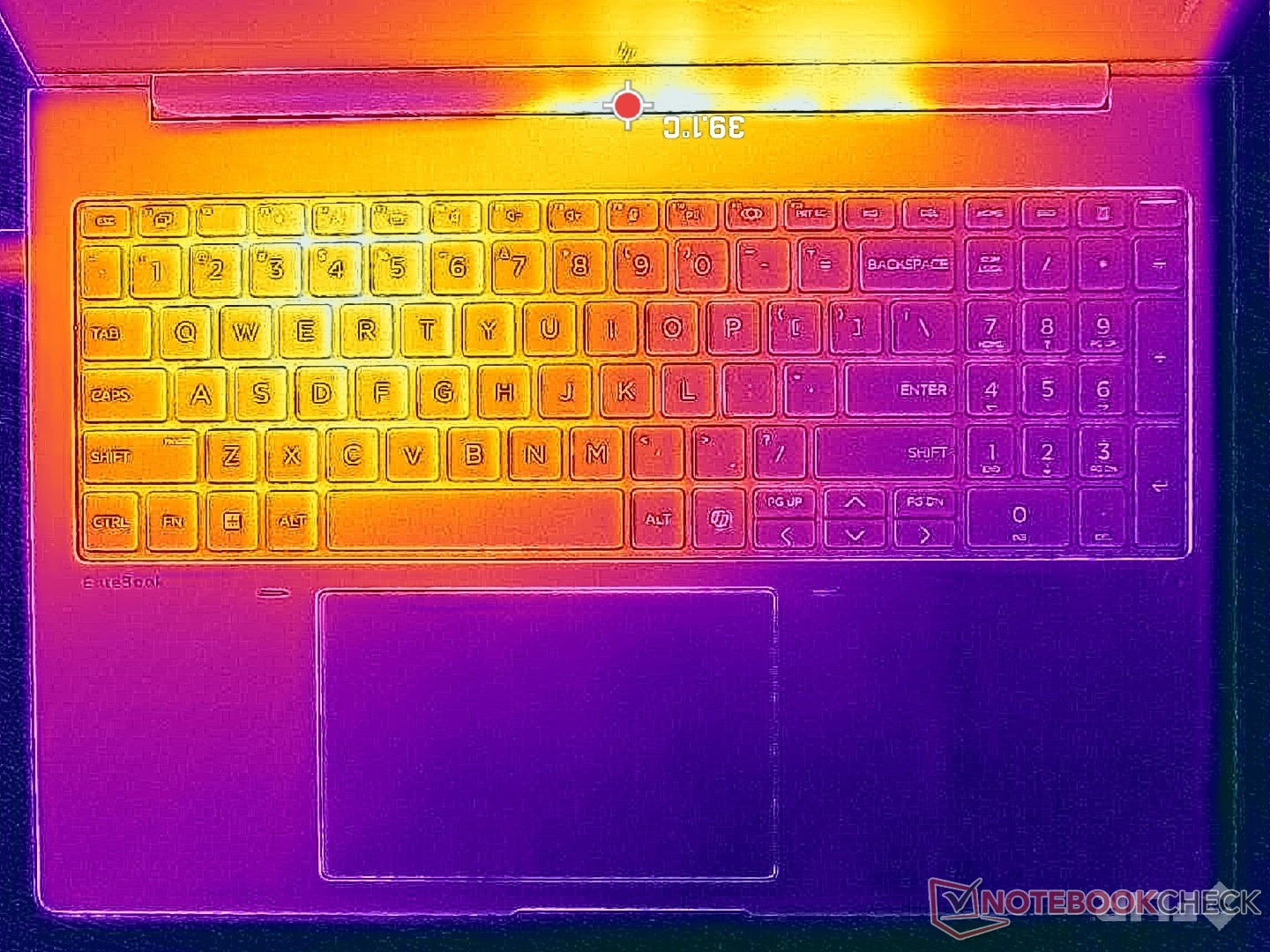 Surface temperatures are warmest on the left half of the system where hot spots can reach up to 39 C and 34 C on the keyboard and bottom surface, respectively. This is nonetheless much cooler than what we recorded on the EliteBook 865 G10 where hot spots would reach 45 C to 50 C under similar conditions.