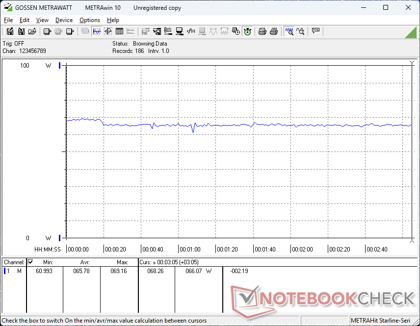 The system is slightly more demanding than the ExpertBook B5 when running Prime95 even though CPU performance between our AMD and Core Ultra 5 225H in the Asus is neck-to-neck. Consumption would again be about 20 percent higher when running games which roughly complements the faster graphics performance from our Radeon 860M over the Arc 130T. Overall performance-per-watt isn't significantly different when compared to the Arrow Lake Intel Core-H alternative.