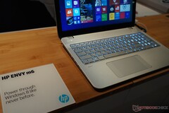 The heart of the Envy m6 lies a Haswell-based dual-core Core i5 or quad-core i7 depending on configuration. The model on show uses the higher-end i7-4712HQ (2.3 to 3.3 GHz, 37 W TDP) with integrated HD 4600 graphics. A quick CineBench 15 test resulted in 596 points, which is very similar to the Core i7-4702HQ. HP is planning an AMD version of the Envy m6 as well, though the APU will likely be based on the Richland series rather than the newer Kaveri series.
