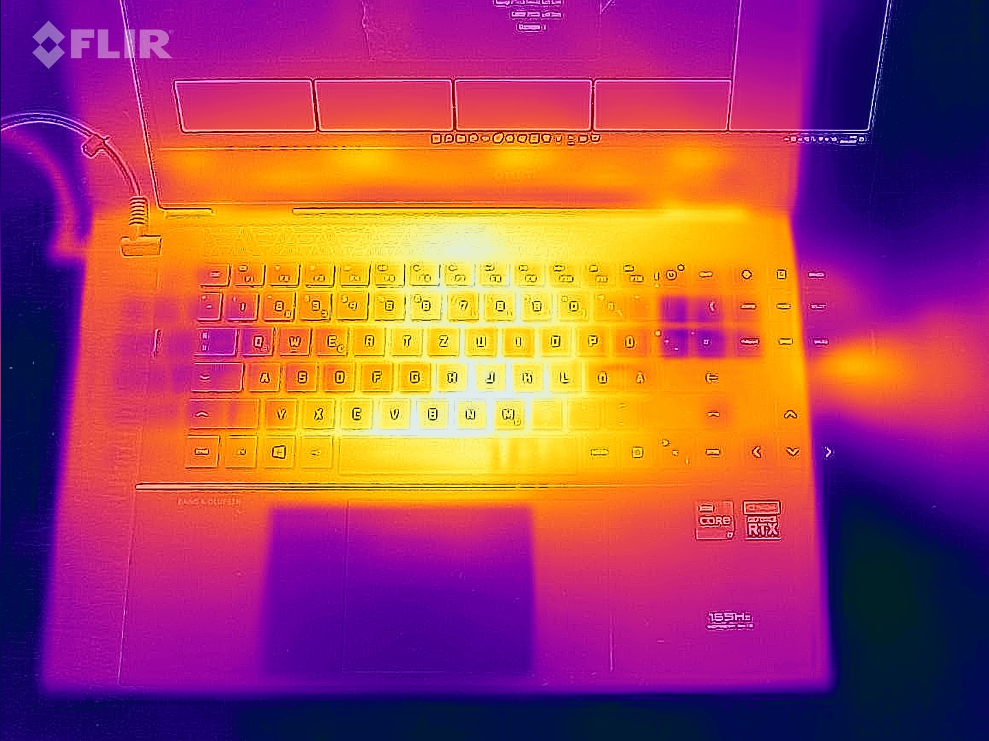 (+) The palmrests and touchpad are reaching skin temperature as a maximum (34 °C / 93.2 F) and are therefore not hot.