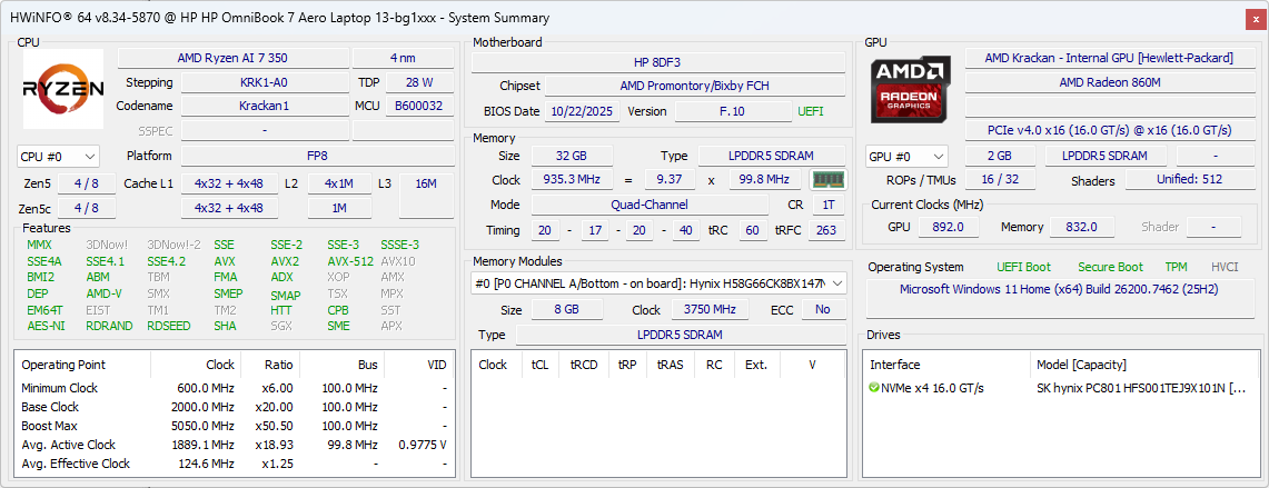 HP is now shipping the OmniBook 7 Aero 13 for $1250 USD with the Ryzen AI 7 350 and 16 GB of RAM.