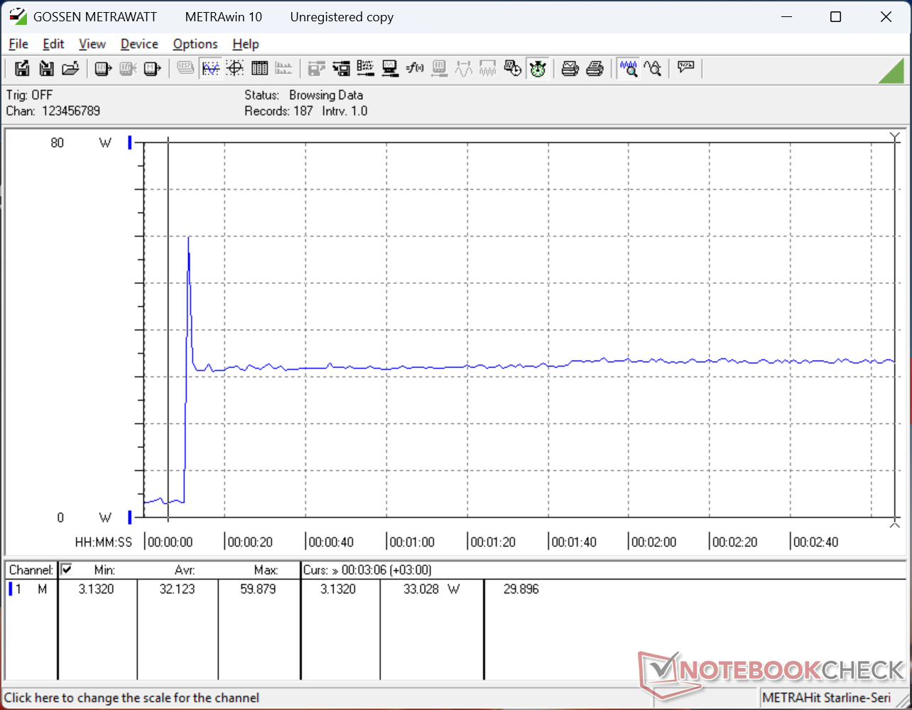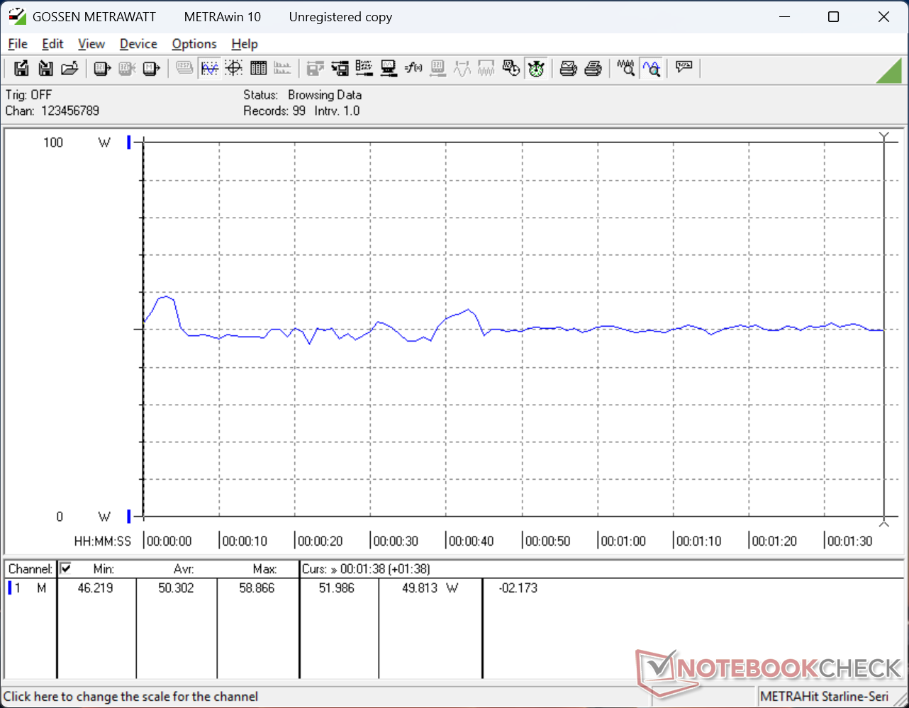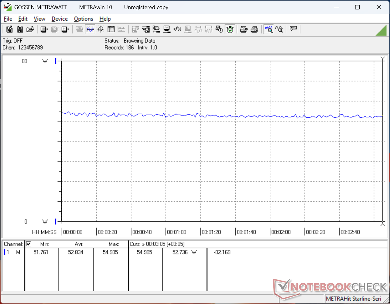 Overall consumption comes close to the Core Ultra H-powered MSI Summit E13 AI Evo while still offering faster processor performance and similar graphics performance. Note that consumption would steadily drop from 48 W to 35 W when idling on Cyberpunk 2077 to suggest slowing performance over time which complements our slowing frame rates recorded in the GPU Performance section above.