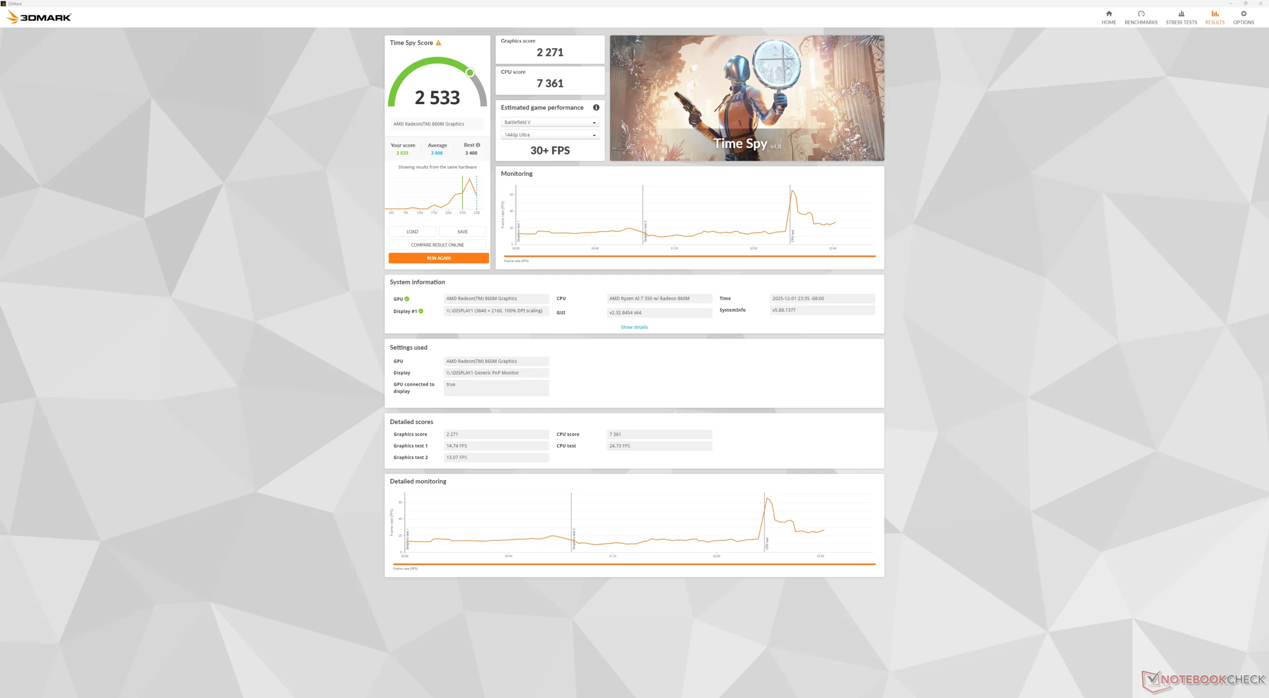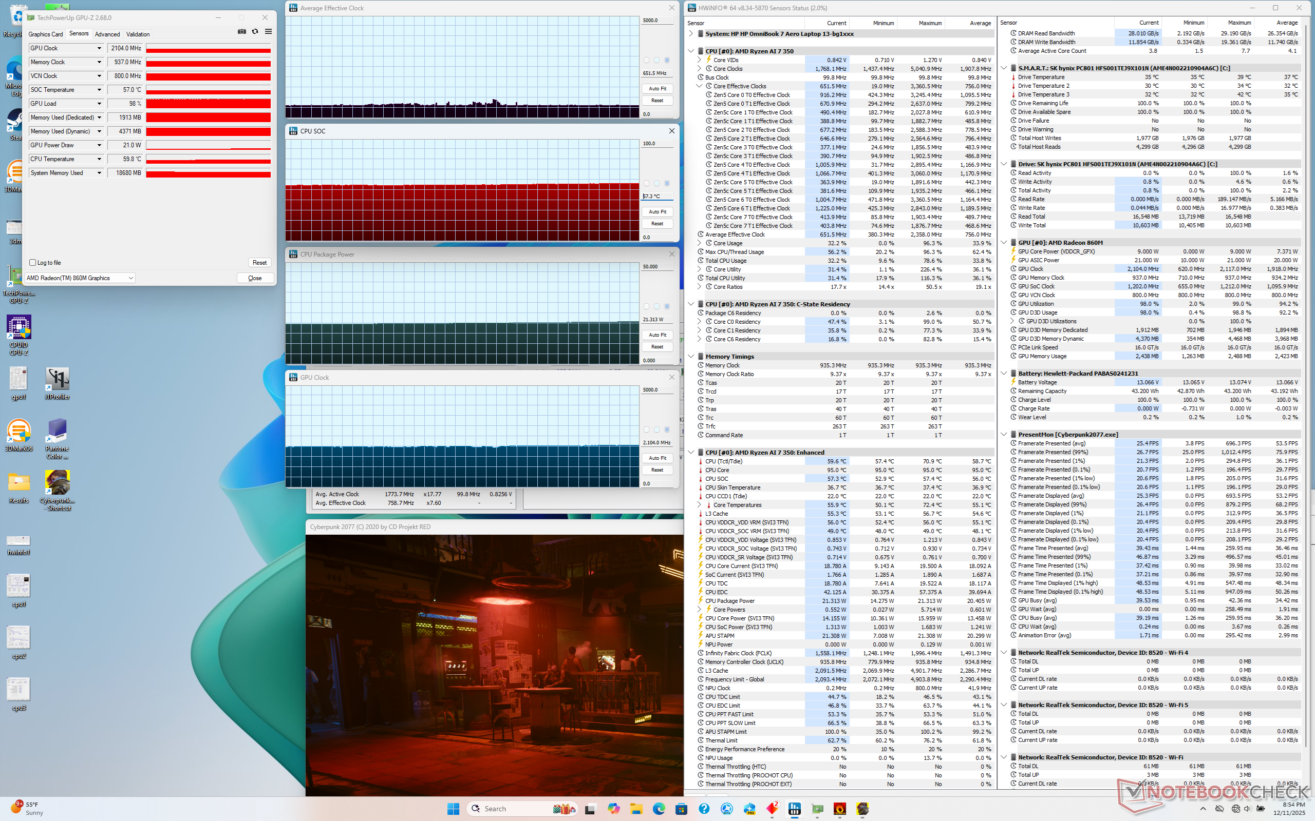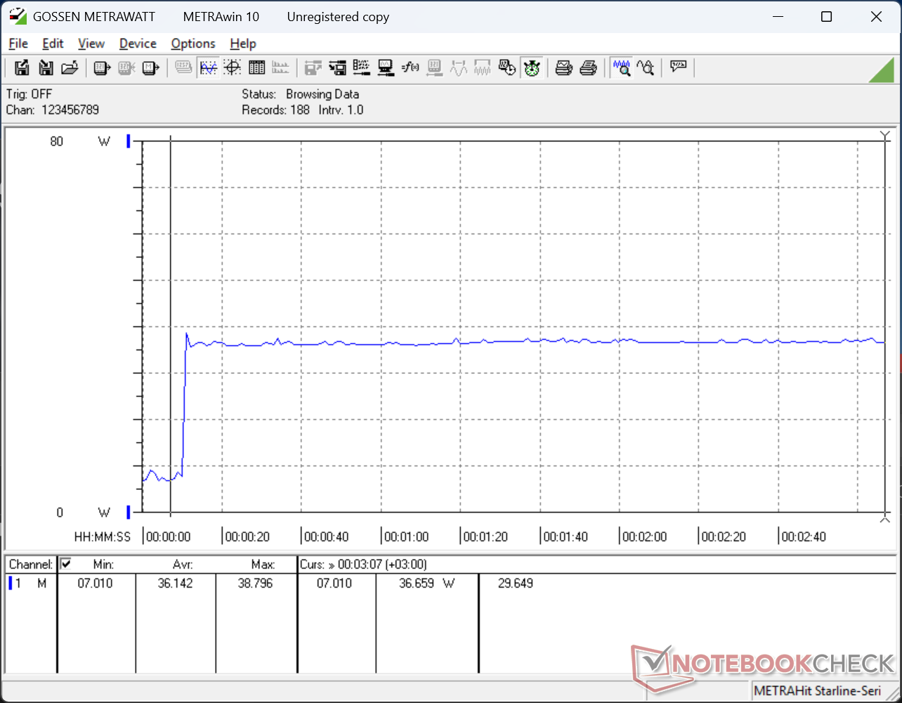 Overall consumption comes close to the Core Ultra H-powered MSI Summit E13 AI Evo while still offering faster processor performance and similar graphics performance. Note that consumption would steadily drop from 48 W to 35 W when idling on Cyberpunk 2077 to suggest slowing performance over time which complements our slowing frame rates recorded in the GPU Performance section above.