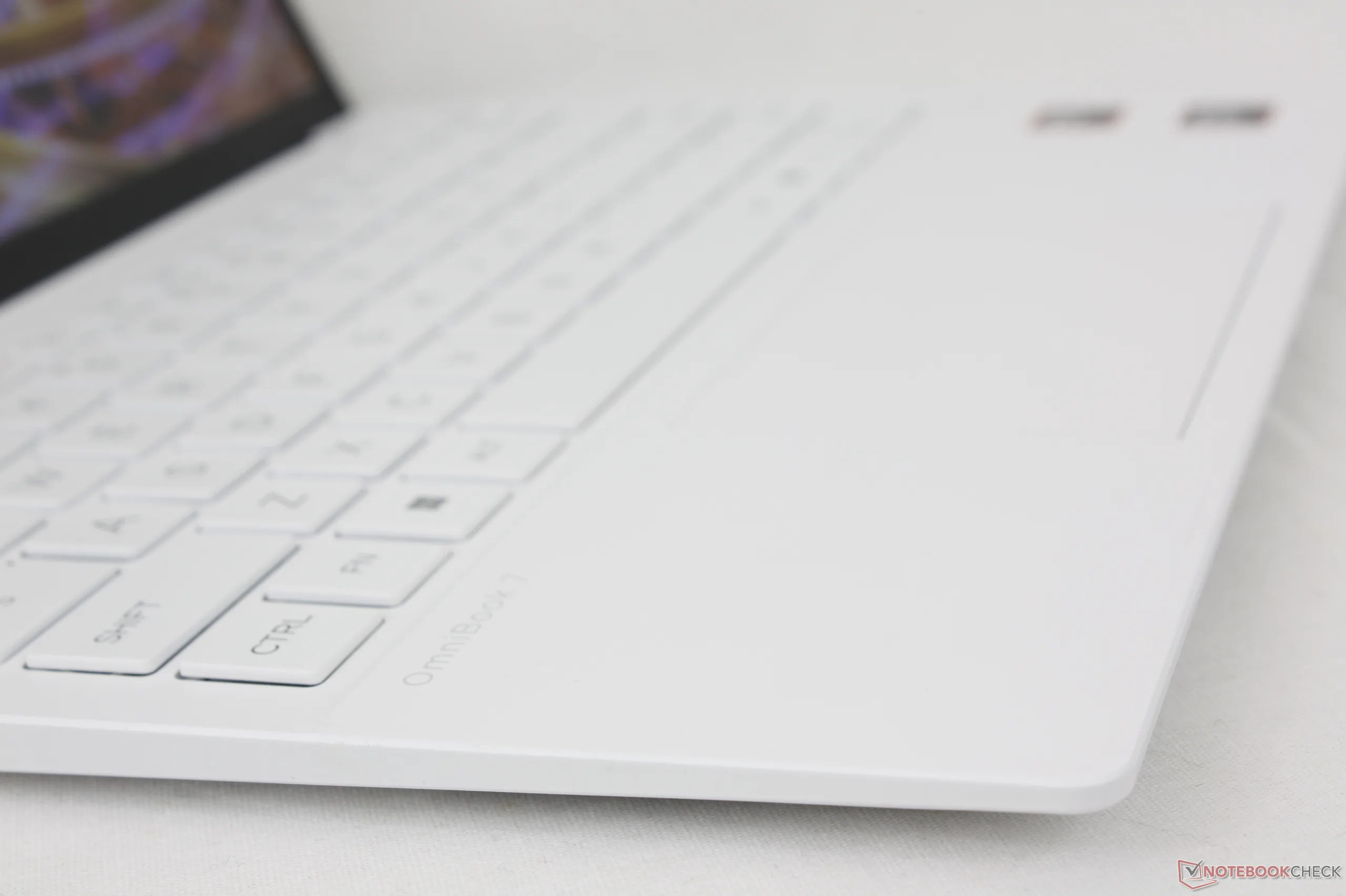 A notable drawback to superlight 1 kg subnotebooks like the LG Gram, Toshiba Portege, Samsung Galaxy Book, or Asus ZenBook S 13 is that their bases and lids tend to flex much more easily than "regular" weight subnotebooks like the Dell XPS, Lenovo Yoga 9, or HP Spectre models. To our surprise, the base of the OmniBook 7 Aero 13 is quite rigid for better-than-expected first impressions. The lid is slightly more susceptible to flexing, but it is again much less than on competing models like the LG Gram or Galaxy Book.