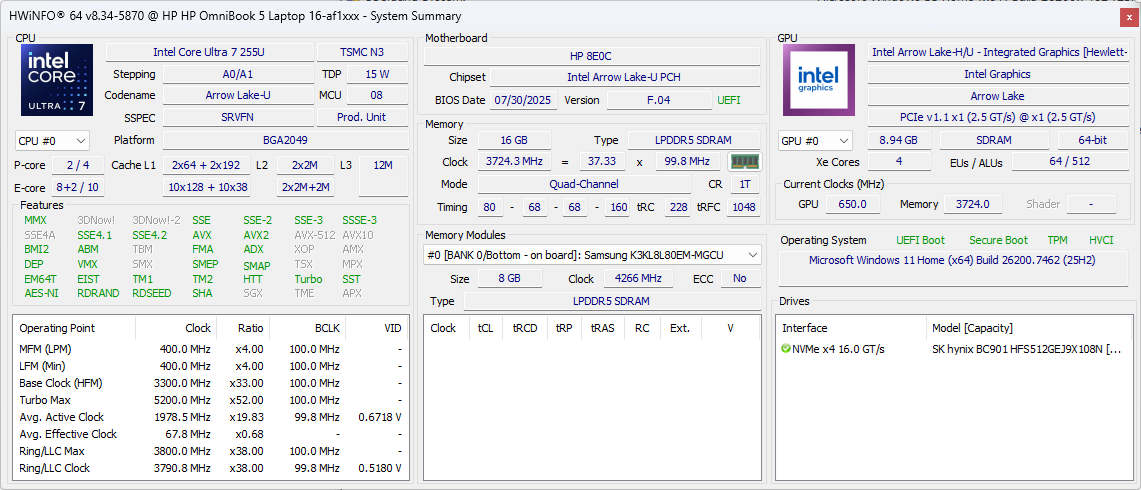 | HP Omnibook 5 16-af1037nr Intel Core Ultra 7 255U ⎘ Intel Graphics 4-Core iGPU (Arrow Lake) ⎘ 16 GB Memory | Amazon: $652.00 List Price: 660 USD | 1.7 kg | 18.6 mm | 16.00" 1920x1200 142 PPI IPS | |