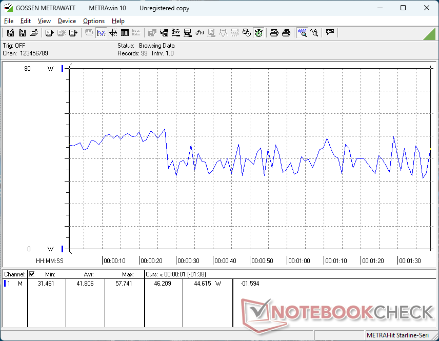 Overall consumption is close to what we recorded on the Lunar Lake V-powered Dell 16 Plus while providing similar CPU performance but significantly slower graphics performance. The small 65 W USB-C AC adapter is sufficient for the level of performance and power demand.
