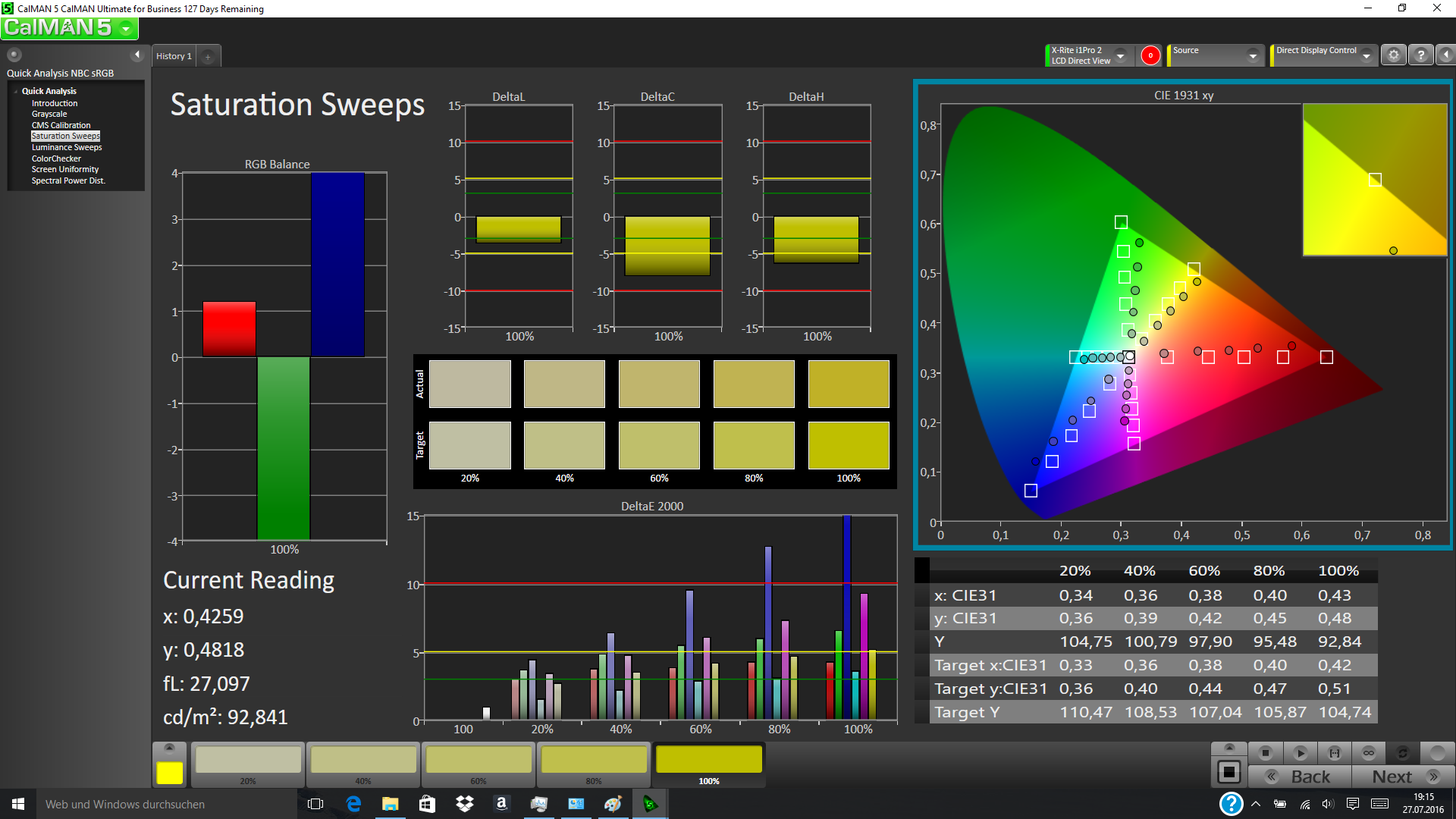 The color reproduction is appealing right after unboxing. An average dE of just over 4 is only slightly higher than the desired rate of 3 or less. Only the darker blue tones are a bit too high, but a bluish tint is not present. The average gray levels of 2.53 are already very good without calibration. However, the coverage of the most used color spaces is unsatisfactory. Almost 62.5% of the sRGB color space is covered and only 39.8% of the AdobeRGB. That is too little for working with accurate colors. Nevertheless, the screen scores with high contrast and crisp colors.