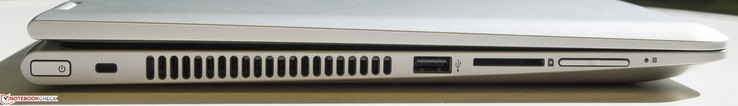 HP installs all necessary interfaces; modern ports like USB Type-C or Thunderbolt are not among them. In addition to three USB ports, a card reader, HDMI, and combo audio jack are present. The interfaces are positioned well. USB on both sides and the majority of the other interfaces are on the rear, which has a favorable impact with the cable situation on the desk.