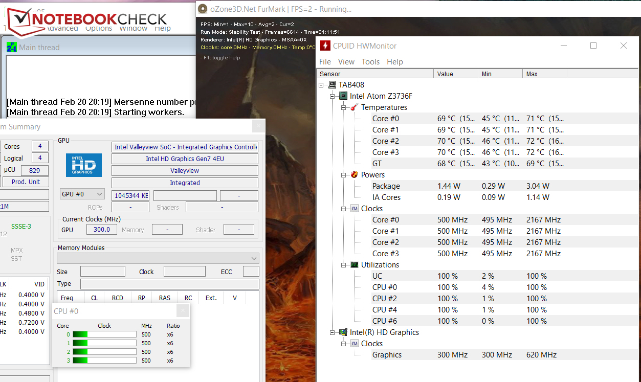 The tablet performed our stress test (Prime95 and FurMark run for at least one hour) in the same manner in both AC and battery mode. The processor already throttles in the first minutes: It drops from 1.58 GHz to 1.33 GHz. Throttling gradually continues in the further course until a speed of 500 MHz is reached. It looks similar with the GPU. Its final speed is 300 MHz. The tablet heats up palpably despite the low speeds. Forty degrees Celsius (104 Fahrenheit) are surpassed on several measuring points.