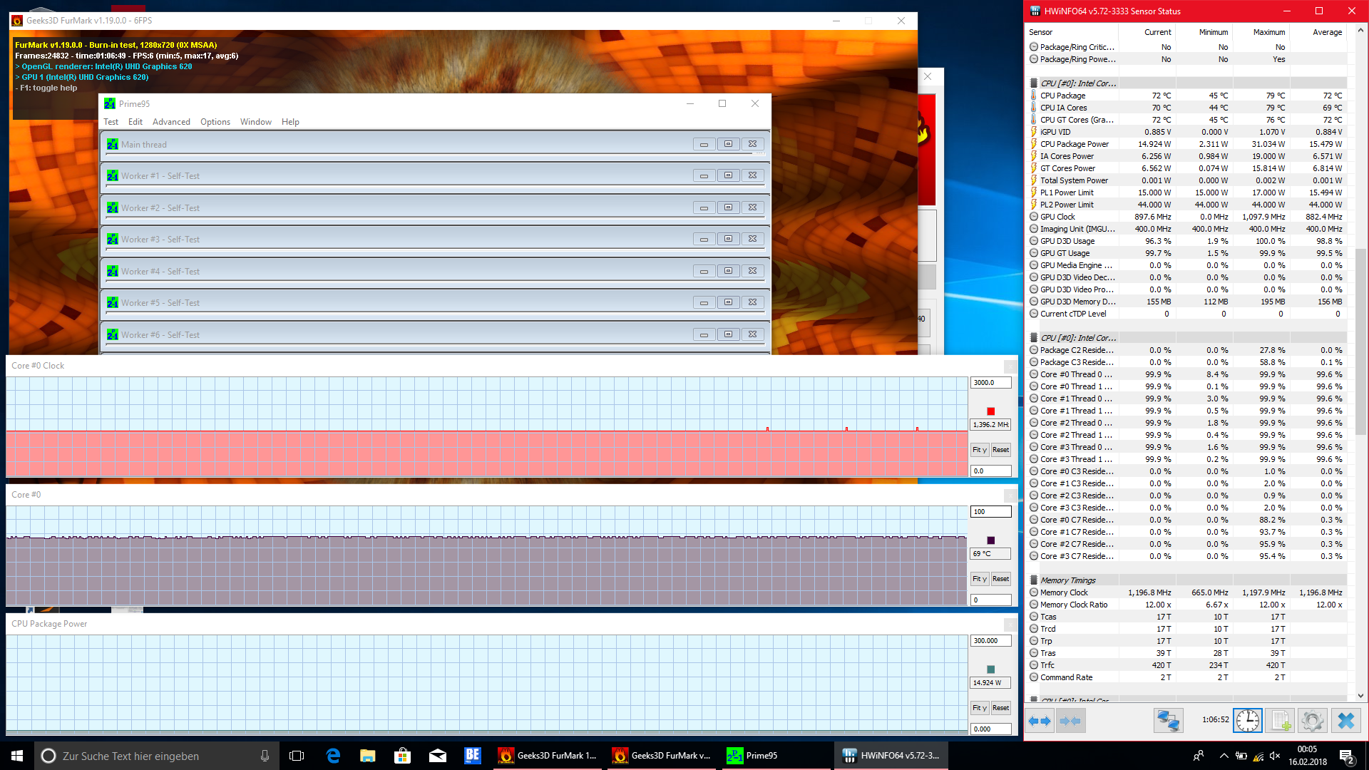Like in the Cinebench test, the CPU consumed 30 watts for 28 seconds in the FurMark+Prime95 stress test. After that, its consumption was throttled to 17 watts. As the CPU and GPU had to share this available power, the CPU clock rate was lower than in the Cinebench test and lay at the base clock rate of 1.5 to 1.6 GHz. During the one-hour test, the temperatures reached a maximum of 79 °C (~ 174.2 °F). It seems that this is the temperature limit as the clock dropped even further to 1.3-1.4 GHz after reaching that temperature.