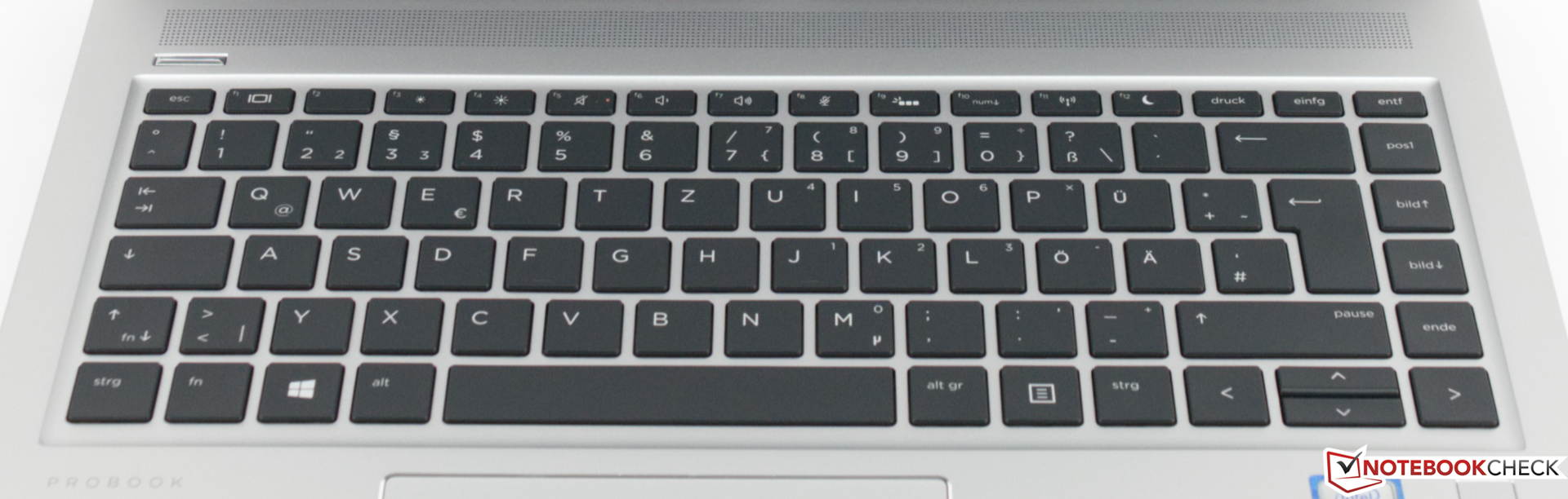 Visually speaking, nothing has changed compared to the ProBook 440 G5. The six-row chiclet keyboard looks clear and offers a comfortable typing experience thanks to its large keys. This is supported by the significant pressure point, which, however, cannot be adjusted. Key attenuation is not too strong, thereby avoiding a spongy typing experience. There was a construction-related issue with the W key on the ProBook 440 G5. This is no longer the case on its successor. The keyboard gives way only under strong pressure, which should not occur when typing normally.