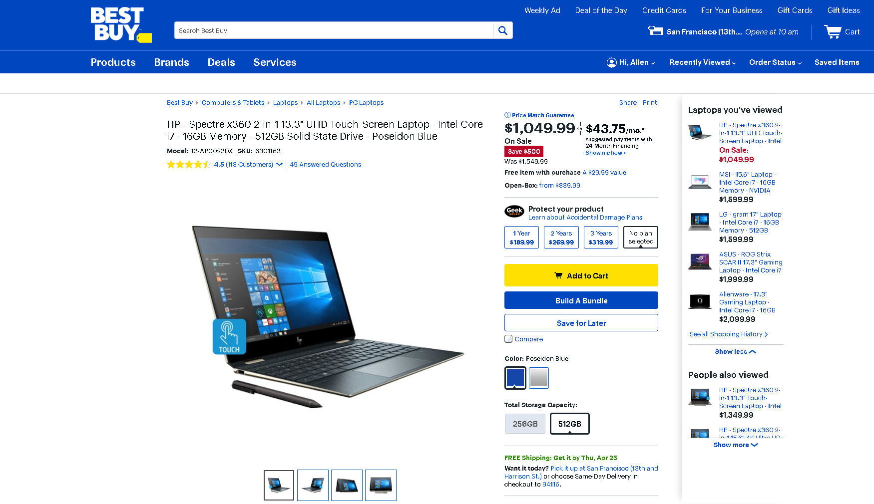 Best Buy is currently running a promotion on the Spectre x360 13 for $1050. This particular deal is notable because it involves a high-end configuration that includes a 4K UHD touchscreen, 512 GB SSD, 16 GB of RAM, and a Core i7-8565U CPU. A Dell XPS 15 equipped with the same 4K display and 512 GB SSD option would cost several hundred dollars more than the HP.