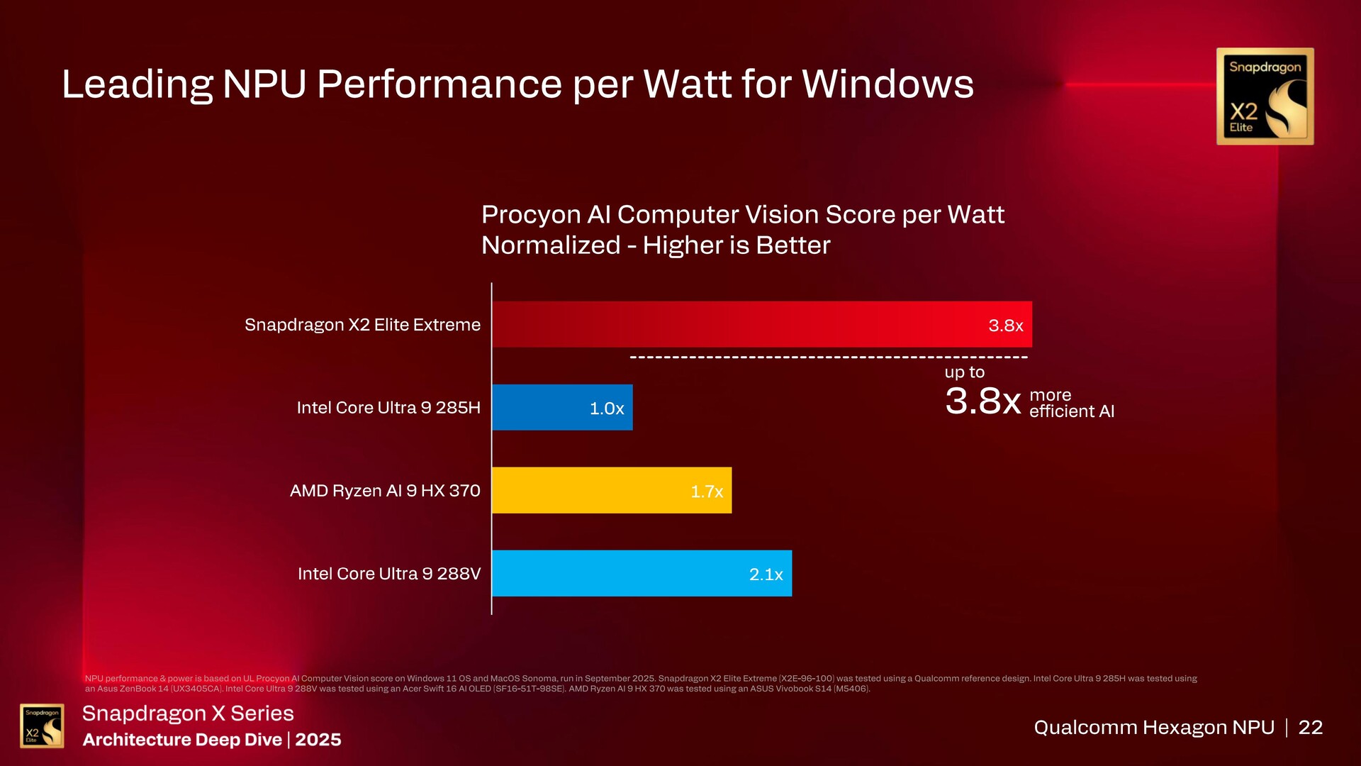 Qualcomm is pitching the Hexagon NPU 6 in the Snapdragon X2 Elite Extreme as the world's fastest, with up to 5.7x the performance and 3.8x higher efficiency compared to the Core Ultra 9 285H's NPU in Procyon AI Computer Vision.