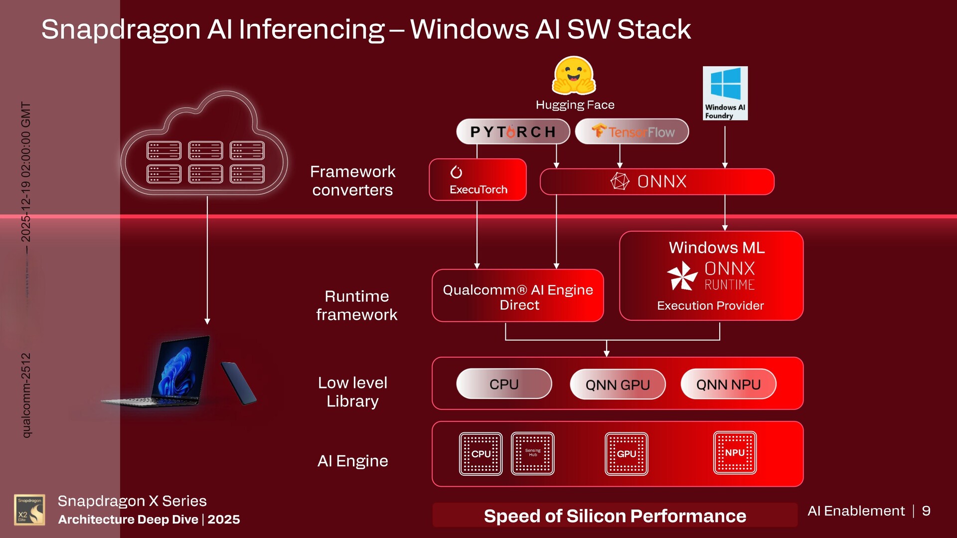 Qualcomm says that Snapdragon AI inferencing works with the Windows AI software stack to enable next gen agentic workloads. Supported open ML frameworks include PyTorch and TensorFlow.