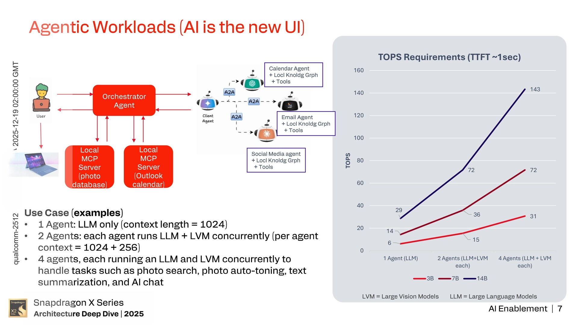 Qualcomm highlighted how a single LLM agent with a 1024 context length and 14 billion parameters (14B) would require up to 143 TOPS of AI processing power while agentic use cases with two (3B) or four agents (7B), each running an LLM and LVM concurrently, can require up to 72 TOPS.