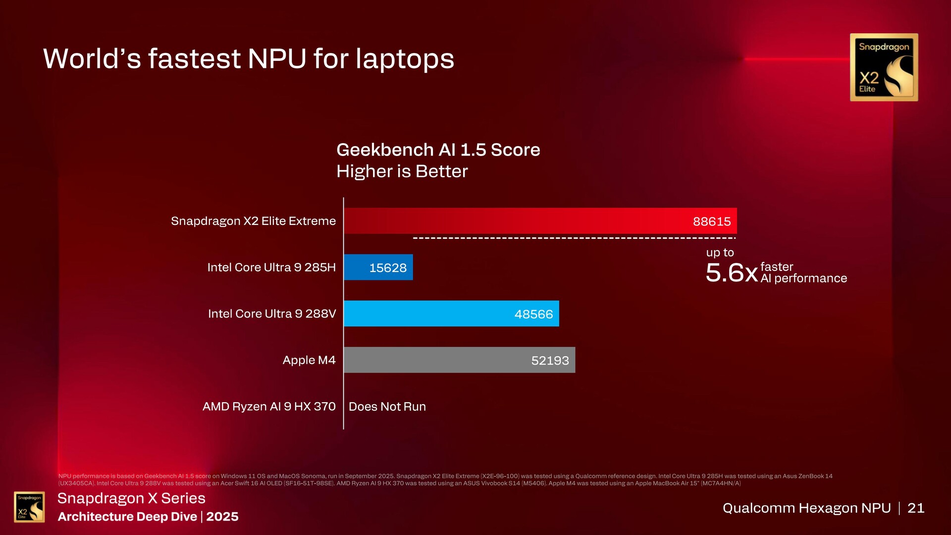 The company claims that the latest Hexagon NPU is the fastest NPU on laptops with up to 80 TOPS of AI processing power. That's nearly a 78% increase from the 45 TOPS we've seen with the Snapdragon X lineup.