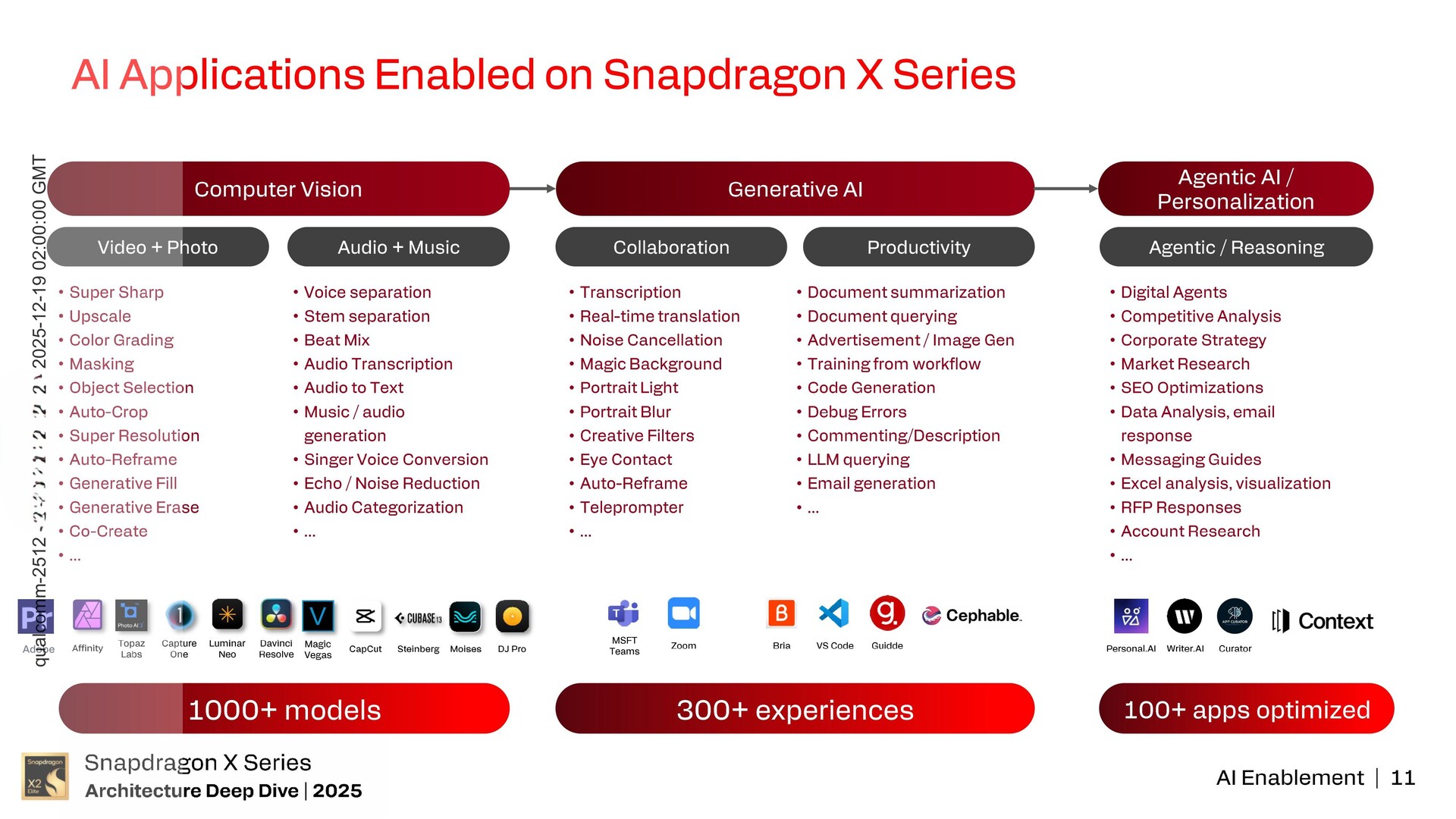 Snapdragon X series SoCs laptop CPUs currently support more than 1,000 models and more than 300+ experiences spanning audio, video, photo, generative AI, agentic AI, and reasoning.