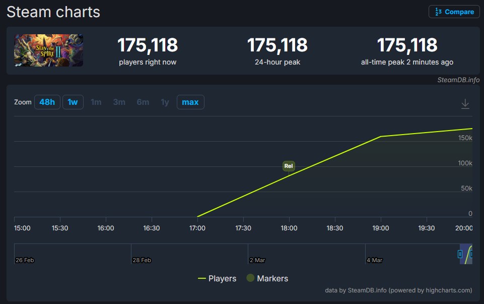 According to data from SteamDB, the game reached over 175,000 concurrent players on Steam just a few hours after release. This is a very strong start, especially for an early access title. For comparison, the original Slay the Spire reached a peak player count of 57,025 players around three months ago. That means the sequel has already surpassed its predecessor’s peak by almost three times within only a few hours of launch.