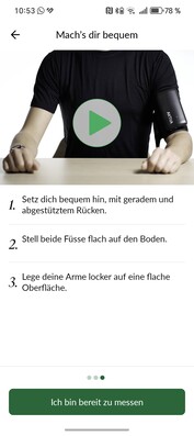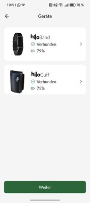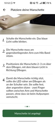 The supplied cuff (Bluetooth 4.2) is used for this purpose and can be easily paired within the app. Once the app recognises that both devices are connected, the calibration process can be started, which is guided step by step. Optionally, videos can also be played to explain the individual steps again. Calibration is performed by taking three consecutive measurements, with the Hilo band worn on the weaker hand and the cuff on the opposite side. This works without any problems in the review and we find the setup very clear and easy to perform, even for people who are less technically inclined.
