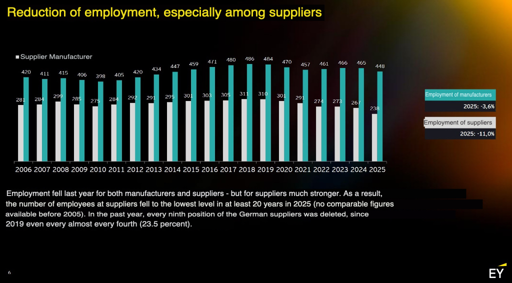 According to the analysis, this ongoing weakness in demand is directly affecting established car production locations in Germany. Vehicle manufacturers and their suppliers ended 2025 with sales down by a further 1.6 percent. However, the consequences for the workforce are even more serious. The automotive industry cut 6.2 percent of jobs, pushing total employment to its lowest level in 14 years at around 725,000 employees.