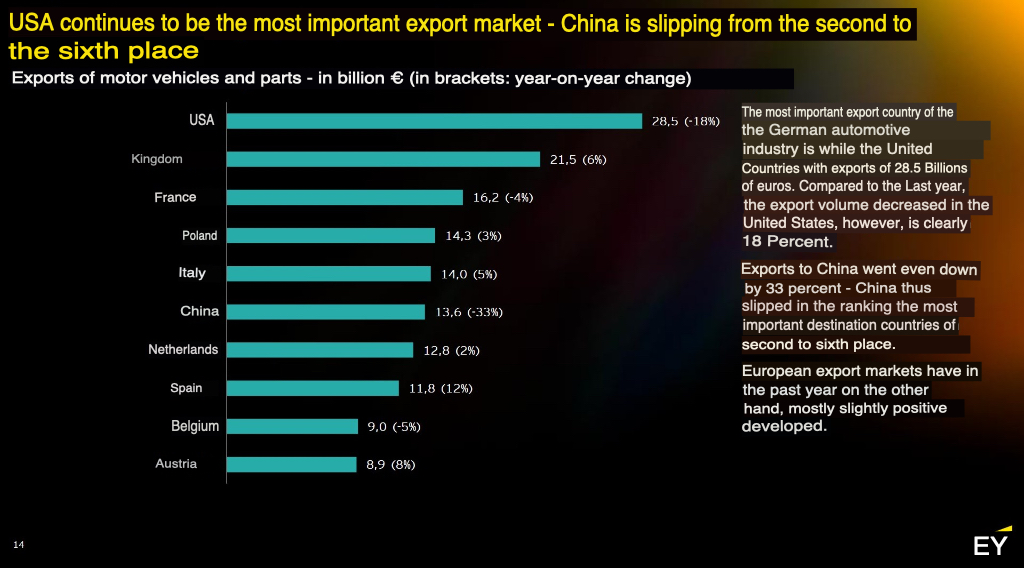 EY study: The USA remains the most important export market, with China slipping from second to sixth place.