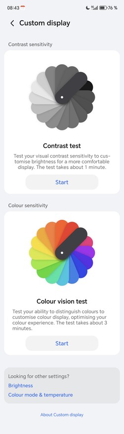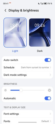 The central point of contact in the Honor Magic8 Pro system is the “Honor Eye Comfort Display” menu item, where all additional functions can be controlled directly. In addition to high-frequency PWM dimming, which can be operated at both 3,840 Hz and 4,320 Hz at low display brightness, there are also common functions such as “Natural Tone,” which adjusts the screen colors to the ambient light. This results in a warmer display, as the proportion of blue light is reduced. The “Circadian Night Display” works in a similar way, designed to reduce the suppression of sleep hormones in the evening. There is also a configurable Dark Mode so that the display shows content in a darker tone in the evening, which most other Android smartphones also offer.