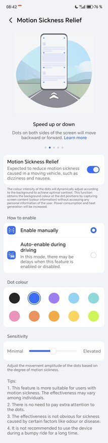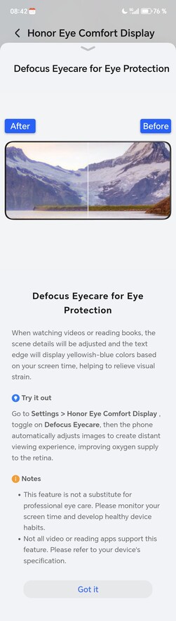 Another Honor-specific feature is “Defocus Eyecare” which simulates looking into the distance to relieve eye strain and supports over 2,000 apps. The Magic8 Pro can also alleviate motion sickness caused by traveling in a vehicle. Colored balls are displayed at the edge of the screen, which move with the acceleration of the vehicle. This is intended to reduce potential dizziness or nausea. In practice, this has worked surprisingly well.