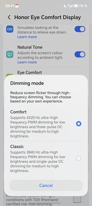 Honor war einer der ersten Hersteller, der seinerzeit auf ein OLED-Display mit hochfrequentem PWM-Dimming setzte und hat dies bei seinen Smartphones seitdem beibehalten. Sicherlich ist dies nicht alles, um ein optimales Seherlebnis zu ermöglichen, doch Honor geht mehrere Schritte weiter und liefert ein Paket, um sein Display möglichst augenfreundlich zu gestalten und ist unter anderem vom TÜV Rheinland zertifiziert.