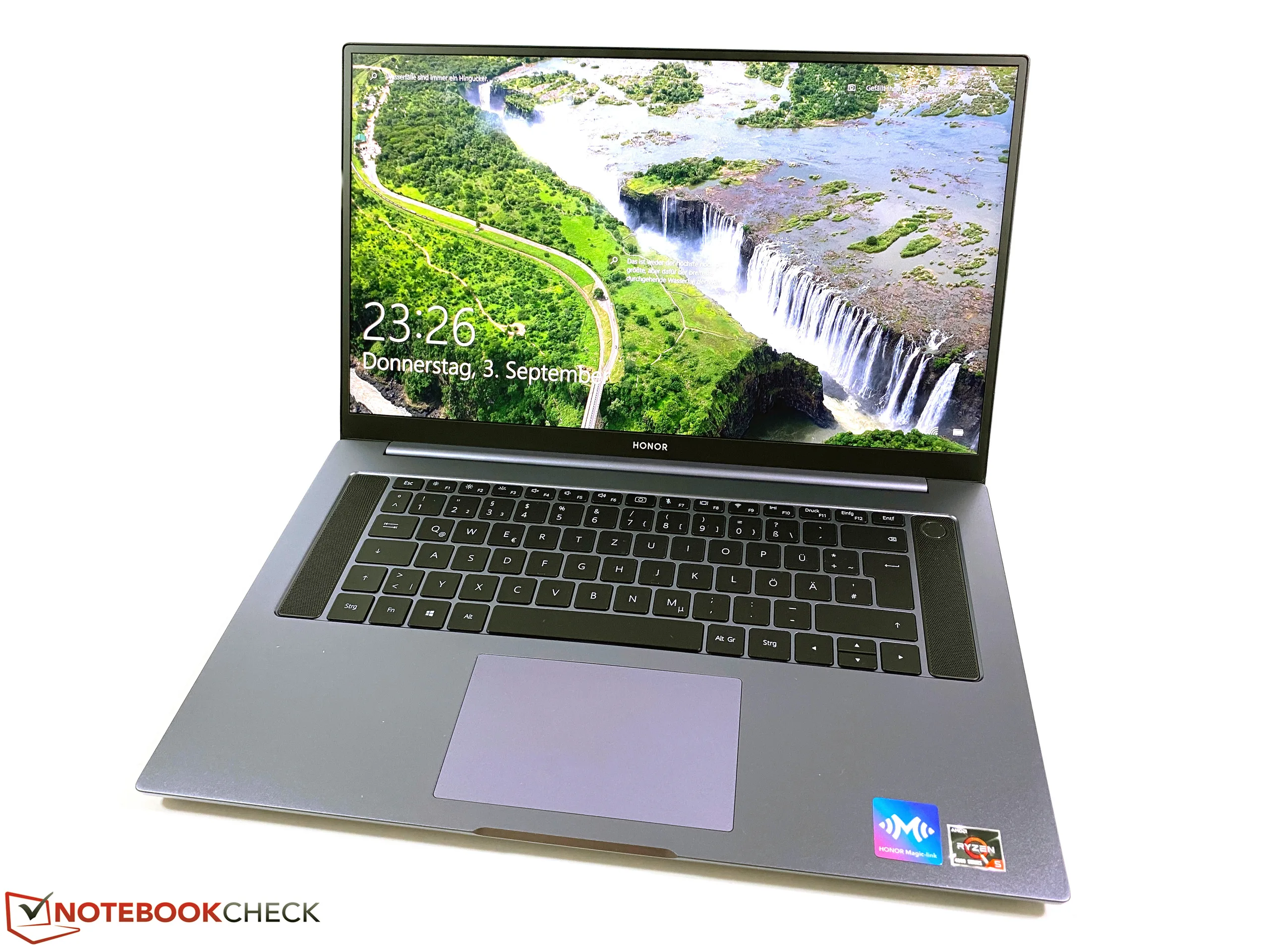 Honor uses a 16.1-inch IPS display (16:9) with the 1080p resolution. The matte panel creates a good picture and even bright contents do not look grainy. Honor specifies the brightness at 300 nits and a contrast ratio of 1000:1, which is confirmed by our measurements. We record more than 300 nits at all 9 measurement spots and even around 340 nits in the center of the screen. The black value is also very low at 0.19, which results in an excellent contrast ratio of ~1600:1. Subjectively, there is no criticism for the screen.
