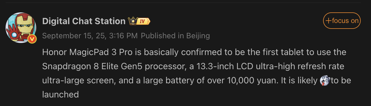 Writing on Weibo, tipster Digital Chat Station suggests that the Honor MagicPad 3 Pro will be the first tablet to feature the Snapdragon 8 Elite Gen 5 processor. Notably, the Snapdragon 8 Elite Gen 5 is expected to be the successor to the flagship Snapdragon 8 Elite chipset. It is expected to be unveiled at the Snapdragon Summit scheduled for September 23. The chipset is expected to bring a major performance boost. It is said to have an AnTuTu score of more than 4 million points.