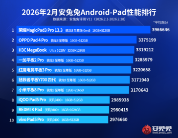 For one, the Honor MagicPad3 Pro leads the tablet rankings. It was launched in late 2025 and features a Snapdragon 8 Elite Gen 5. To be exact, it's the only device on the list powered by the current-gen Qualcomm flagship chipset, which explains its dominance. In second place is the Snapdragon 8 Elite-powered Oppo Pad4 Pro, while the H3C MegaBook takes the third spot thanks to its Intel Core Ultra 5 228V. This chart will likely change in the coming months, considering the recent debut of a Snapdragon 8 Elite Gen 5 tablet like the Lenovo Legion Tab Gen 5.
