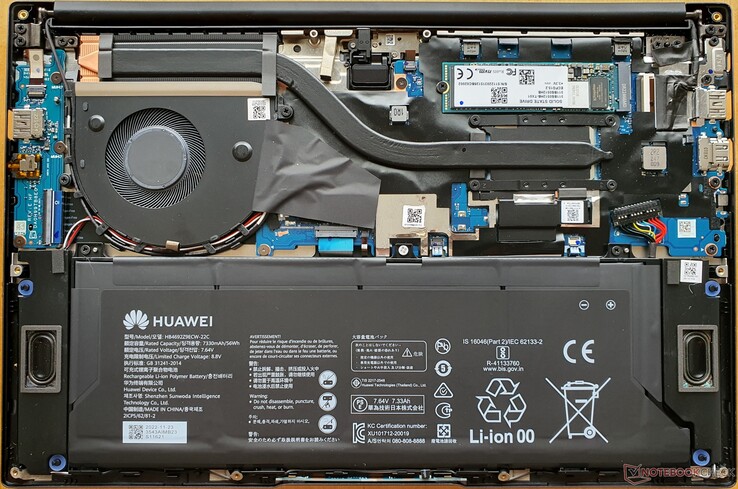 After loosening ten Torx T5 screws, it is very easy to get inside the MateBook. However, not much can be done here. Only the M.2-2280 SSD and the screwed 57 Wh battery can be replaced without much effort. The RAM and the Wi-Fi chip are permanently installed (soldered).
