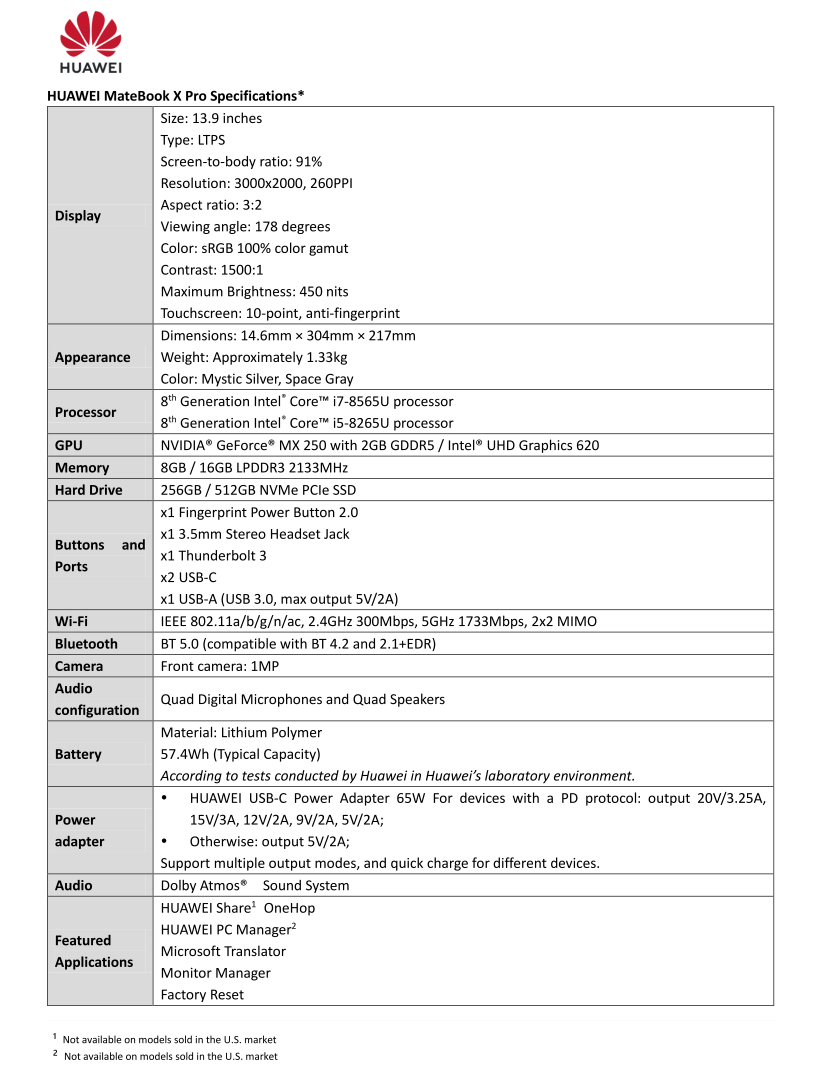 | MateBook X Pro 2018 | MateBook X Pro 2019 | |
