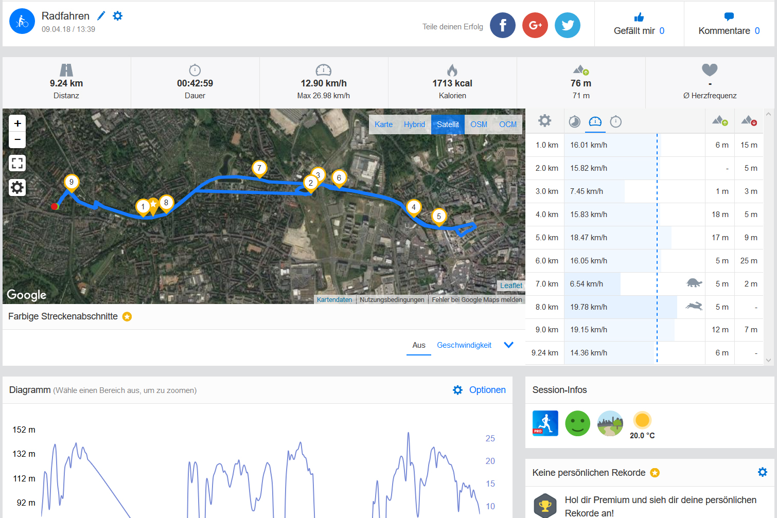 To further test the GPS accuracy, we take the P20 Pro on a bike ride and compare the route mapped with that of a Garmin Edge 500, a professional navigation device. After the first two kilometers (~1.2 mi), the P20 Pro’s energy saving mode kicked in, which brought the route mapping to a standstill. This explains the large deviations in the route mapped compared to the Garmin Edge 500. We set an exception for the tracking app in battery saving to circumvent this issue. Accuracy is ok, but not overly impressive. The P20 Pro tended to map our route next to the cycle route, rarely positioning us correctly. As such, the P20 Pro is suitable for more simple navigation tasks and lacks the accuracy necessary to be useful for bike rides.