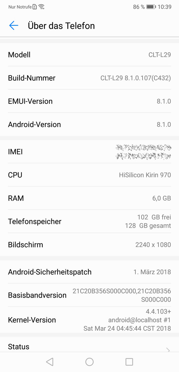 Update 08/28/2018: Huawei rolls out firmware CLT-L29 8.1.0.152(C432) sized at 1.26 GB. Besides the GPU Turbo (here in review), the camera app is slightly optimized and the super slow-motion now includes an AI-based trigger automatic. The security patches are updated to July 1st, 2018.