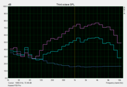 There are two speakers, which flank the USB Type-C port on the bottom of the device. While they sound good, they could produce a more balanced sound for our liking. The Pink noise test reinforces this, showing a small break in the frequency range between 1,500 and 1,800 Hz. This makes the audio sound a bit dull when played through the speakers. The speakers reach up to 85 dB(A) with barely any distortion at maximum volume. One minor issue that we did notice is that mid-tones sound weaker than other tones at high volumes.