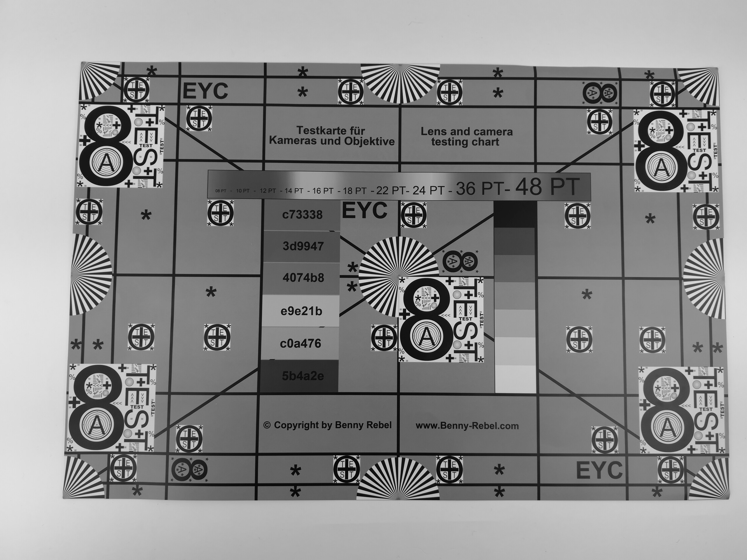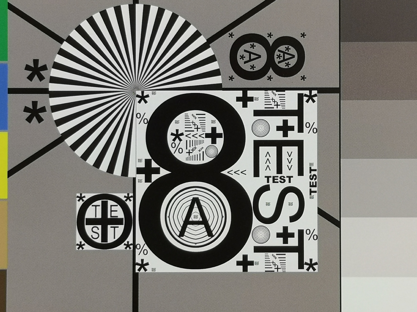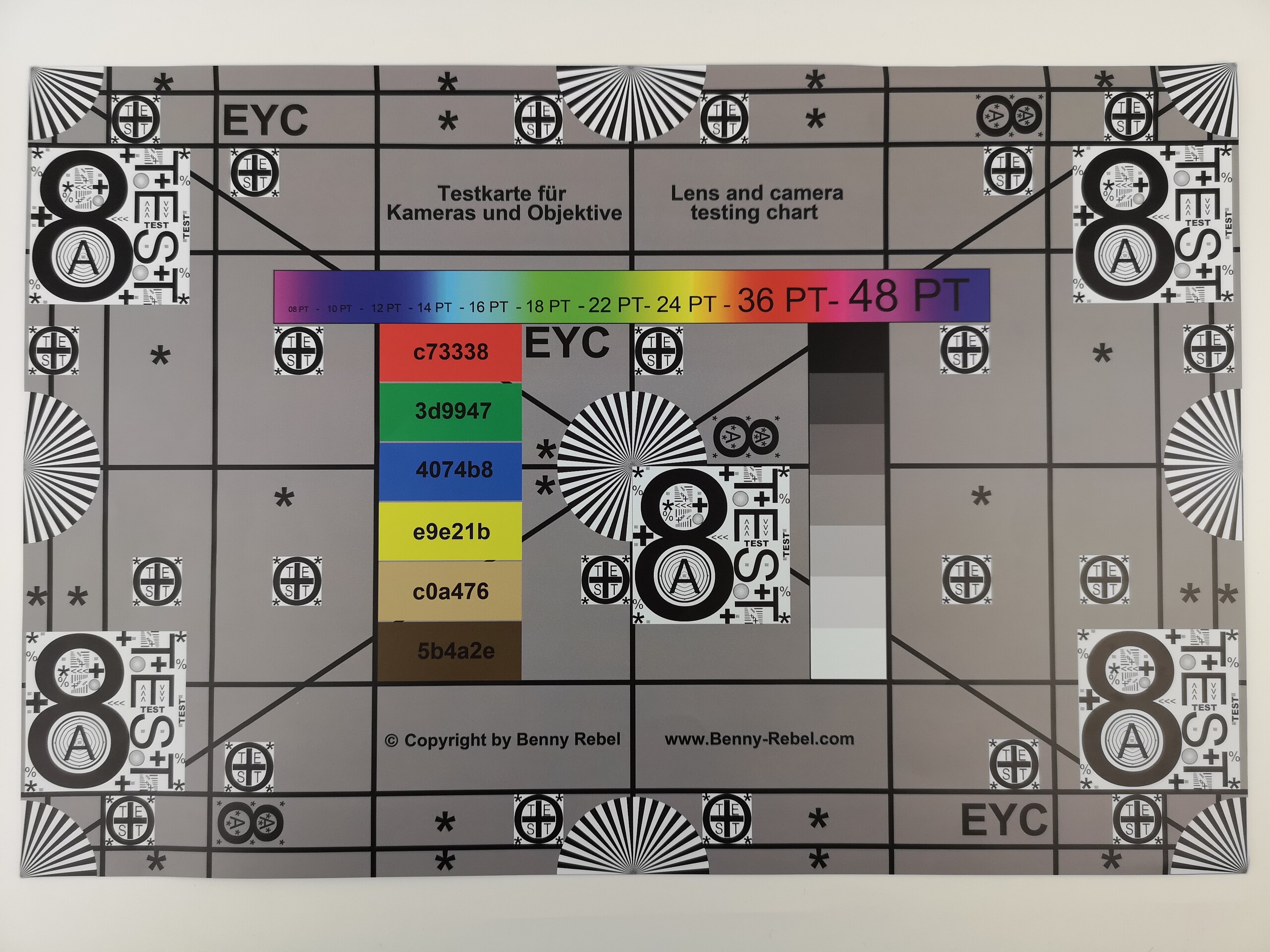 We took the photograph of our test chart in standard mode, which is at 10MP with AI on. Focus is sharp at the center of the chart, while color gradients are clean. Only the fonts on a dark background lack edge sharpness. We can see a slight blur at the edge of the picture, which is not present in normal images. The 40 MP sensor improves edge sharpness. Unfortunately, the same cannot be said for the 20 MP monochrome sensor, with visible blurring at the edges of the image.