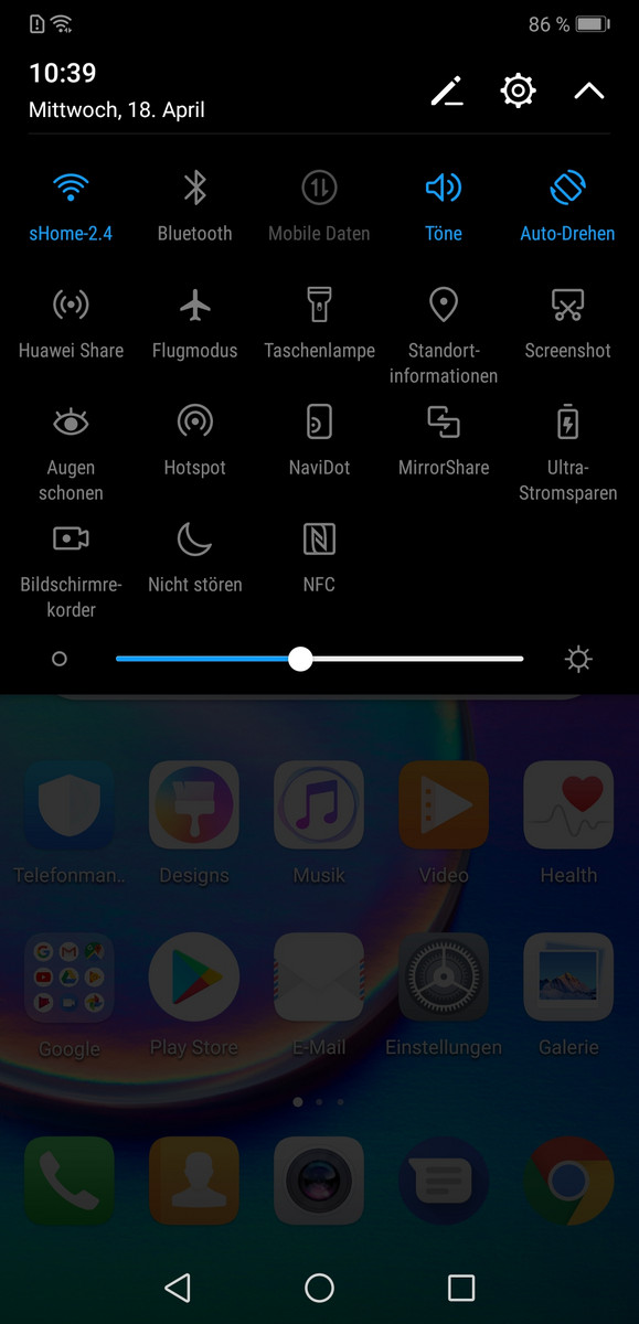 Huawei implements what they call Natural Tone Display, which is similar to Apple’s True Tone Display. The brightness sensor regulates the display’s color temperature according to the ambient light. This automatically reduces blue light in dark environments by increasing the color temperature. The P20 Pro also has a night mode. Thanks to the combination of software and the minimum luminosity of 1.6 cd/m², the P20 Pro is ideal for reading eBooks even in the dark.