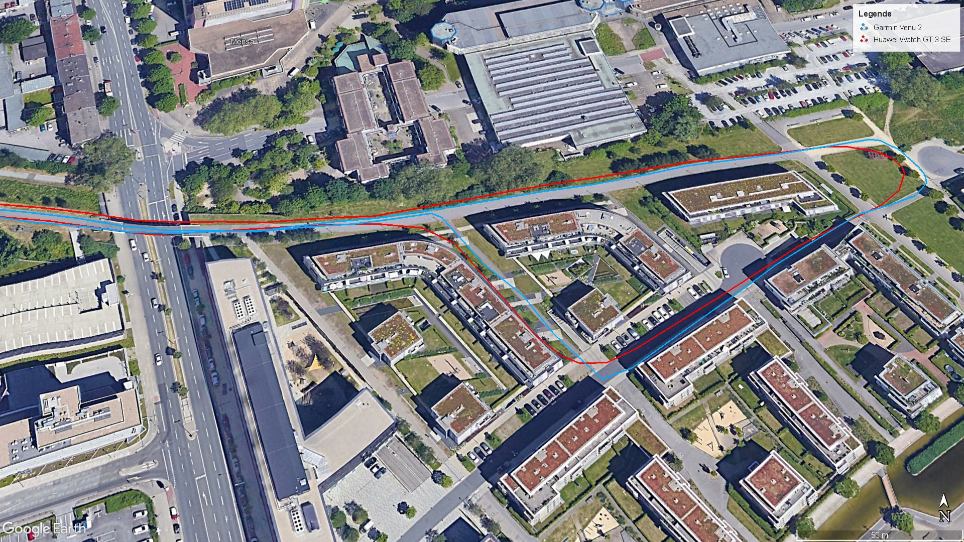 According to Huawei, the wearable has a high-precision GNSS positioning chip with five systems supported. Similar to the heart rate measurement, however, the GPS detection of the Huawei Watch GT 3 SE is not quite as accurate as we would have liked. Here, it competes against the Garmin Venu 2 as the reference model.