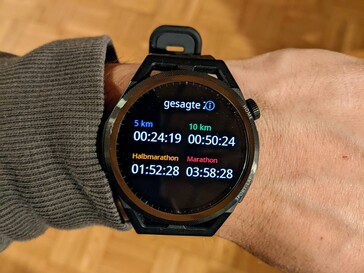 However, these plans - as well as the "trainer feedback" after each week - are currently only available in English. This also applies to the announcements during the run. After each completed kilometer, the watch makes an announcement about the total time, the time for the last kilometer and the current heart rate via the speaker or the paired headphones. The watch also provides regular information on whether the current running session is more for recovery, maintaining the current fitness level or an increase. In addition, the smartwatch provides assessments of the current stress level. The GT Runner calculates a Running Ability Index from the collected values. This value is intended to provide an indication of the runner's potential and fitness. Potential times for different distances are also determined from this. Thus, one can be told how long one would need for a marathon without ever running one.