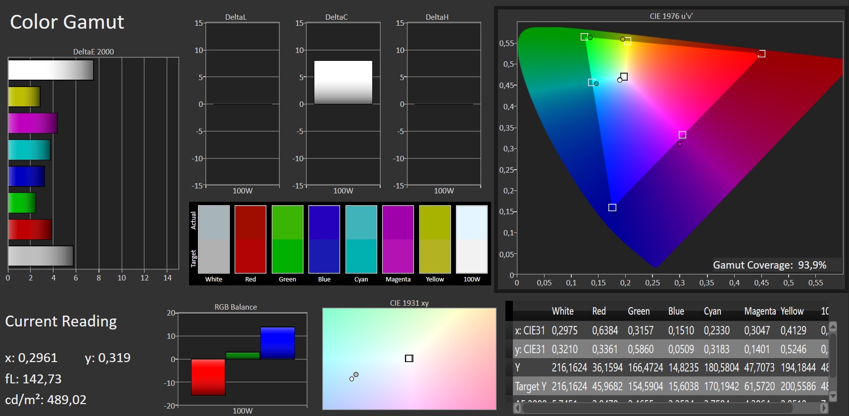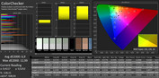 We also used a spectrophotometer and CalMAN software for a more precise measurement of color representation. We noticed a clear blue tint to the display at default settings. White balance can either be manually adjusted or set to one of three presets. The default “cold” preset produces a heavier blue tint and sets colors even further from the reference value. Equally, setting the display to “warm” mode results in higher than desirable color values and creates a green tint to grays. We were able to manually adjust the white balance so that whites are displayed accurately. Light grays look too dark though. We have included a screenshot of the optimal settings for reference. Colors are also more accurate than using the standard settings.