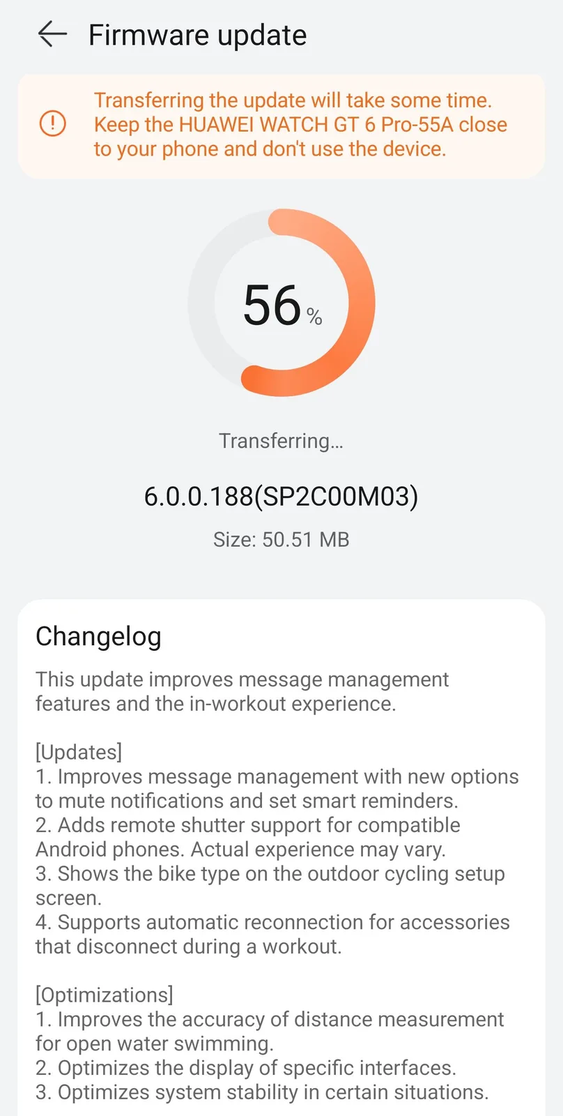 The release notes for the versions of the Watch GT 6 and Watch GT 6 Pro share many similarities. Both mention support for improved notification management, with users able to set up silent notifications and smart reminders. Users of Android devices can now remotely control their smartphone’s camera from the watch, and there is an Alipay-related optimization. Plus, it has been reported in China that an upgraded version of the WeChat app, version 1.1.0, adds support for voice-to-text messaging.